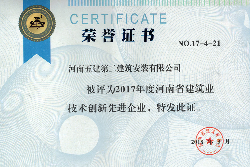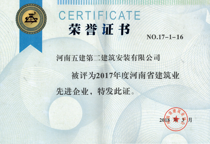 公司榮獲 2017年度“河南省建筑業(yè)前二十強企業(yè)”、“河南省建筑業(yè)先進企業(yè)”等多項榮譽