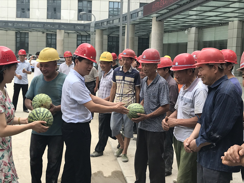 張國(guó)棟院長(zhǎng)一行將礦泉水、西瓜等防暑降溫物品送到大家手中,叮囑大家在緊張施工中,一定要注意防暑降溫,注意施工安全,一句句真切的話語(yǔ),表達(dá)出對(duì)一線職工深深的惦念。此次慰問活動(dòng)給廣大戰(zhàn)斗在一線的工人們帶去了一絲清涼、一縷關(guān)懷,進(jìn)一步營(yíng)造了和諧穩(wěn)定的良好氛圍。