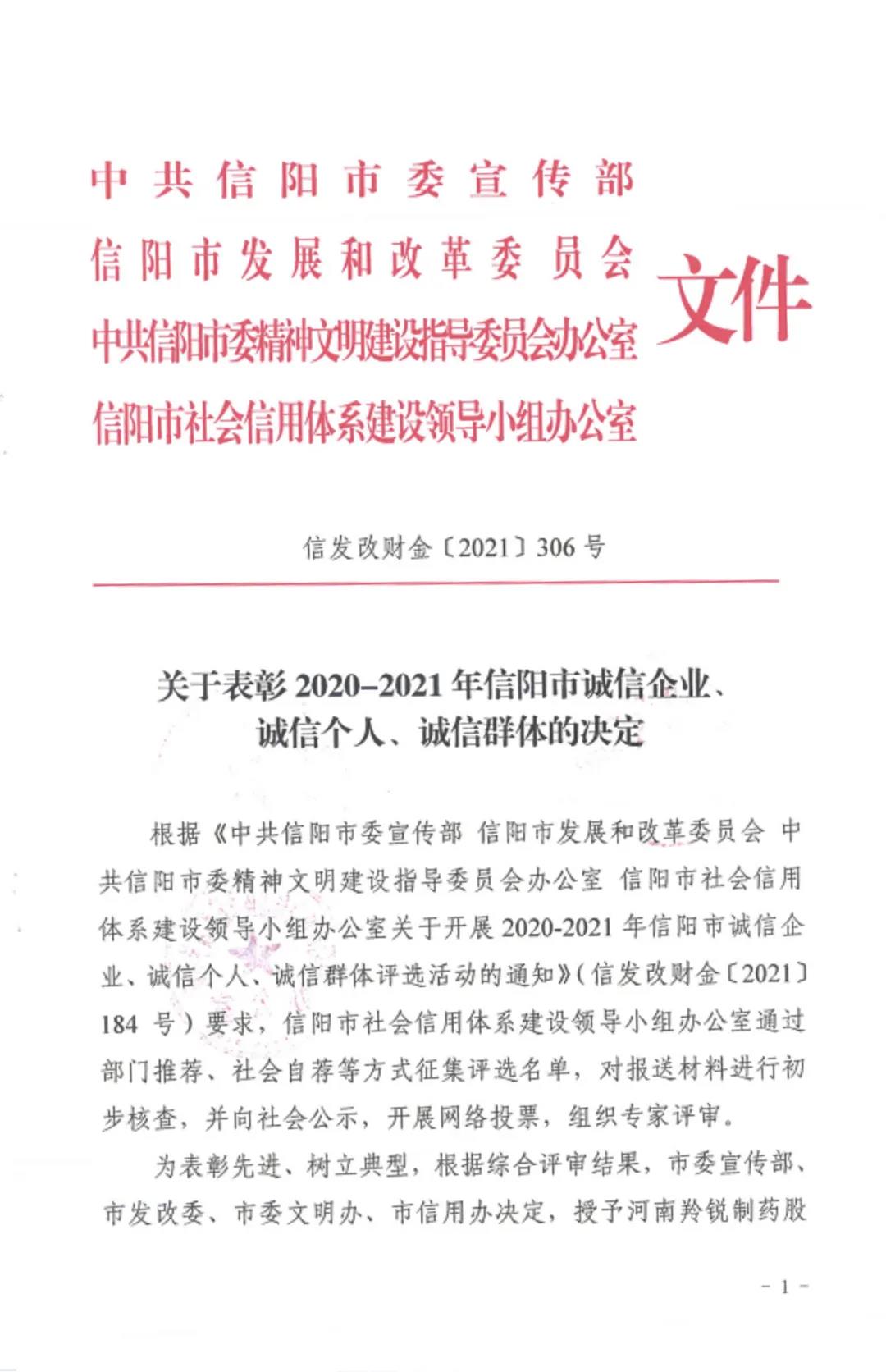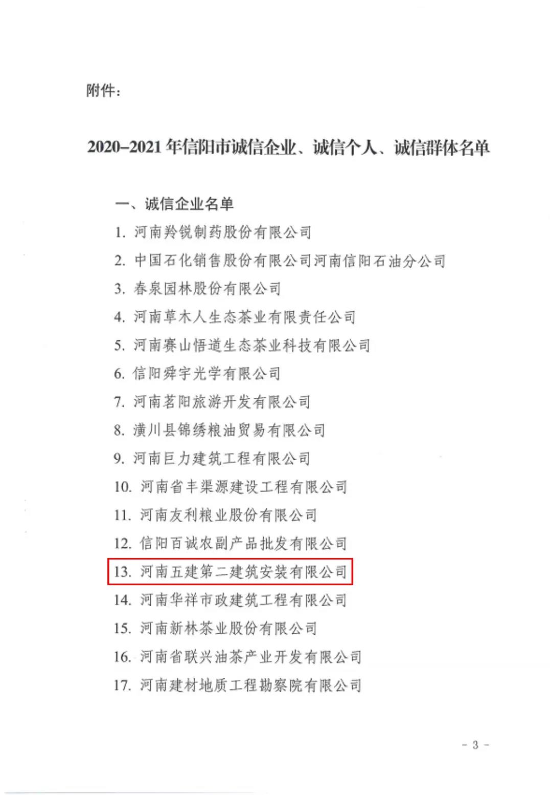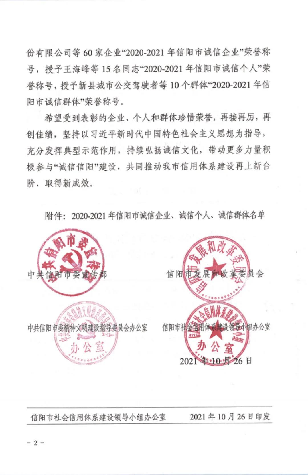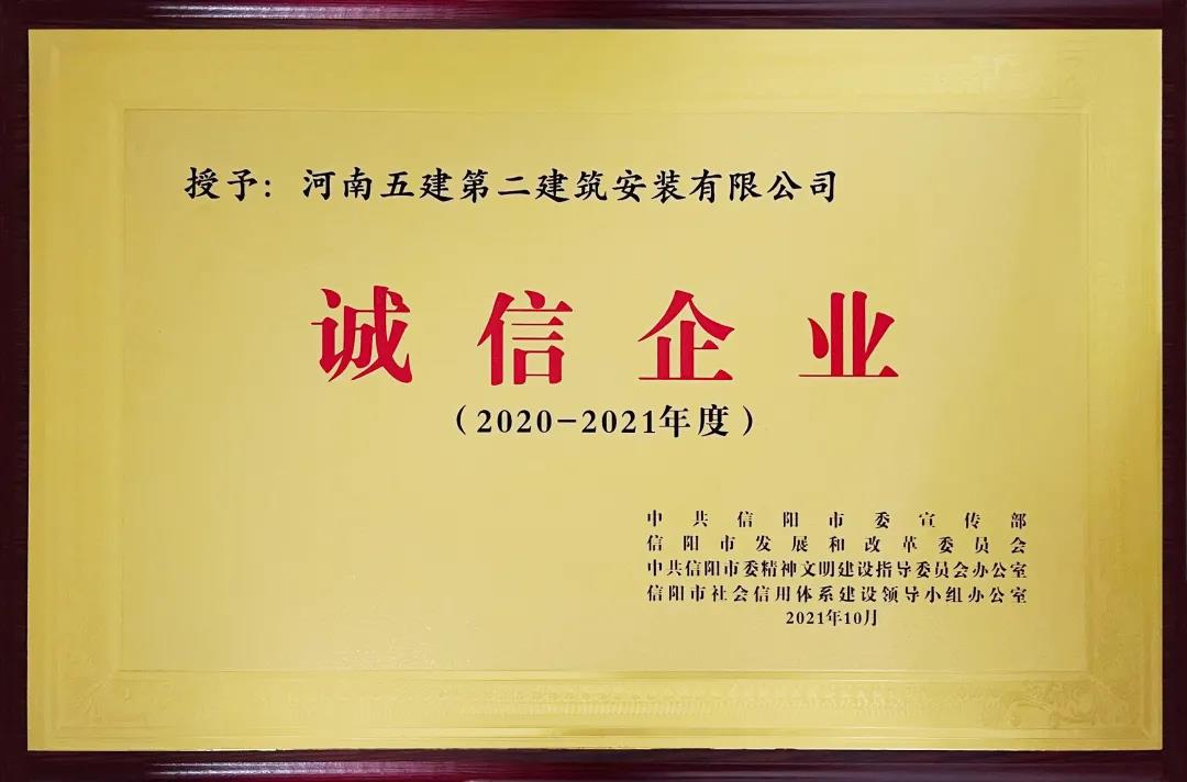 河南五建二公司榮獲2020-2021年信陽市“誠信企業(yè)”榮譽(yù)稱號(hào)